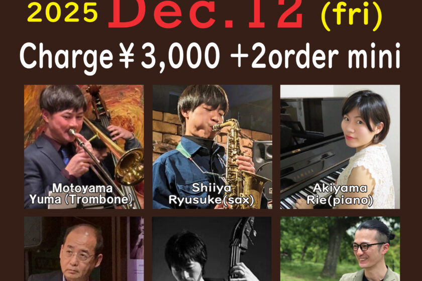 Jazz Live 12月 12 Fri 2025 難波 / Bigsalt845 メンバー 本山裕真(tb)、椎屋龍典(sax)、秋山莉恵(p) Oshio(g)、家口直哉(b)、櫻井ティモ(ds) チャージ¥3000+2オーダー別途要 前のスケジュール 次のスケジュール