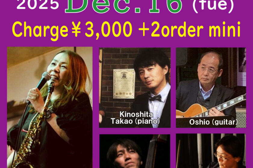 Jazz Live 12月 16 Tue 2025 難波 / Bigsalt845 メンバー 水谷浩子(sax&vo)、木下孝朗(p)、Oshio(g) 近藤哲生(b)、阪井ちょく(ds) チャージ¥3000+2オーダー別途要 前のスケジュール 次のスケジュール