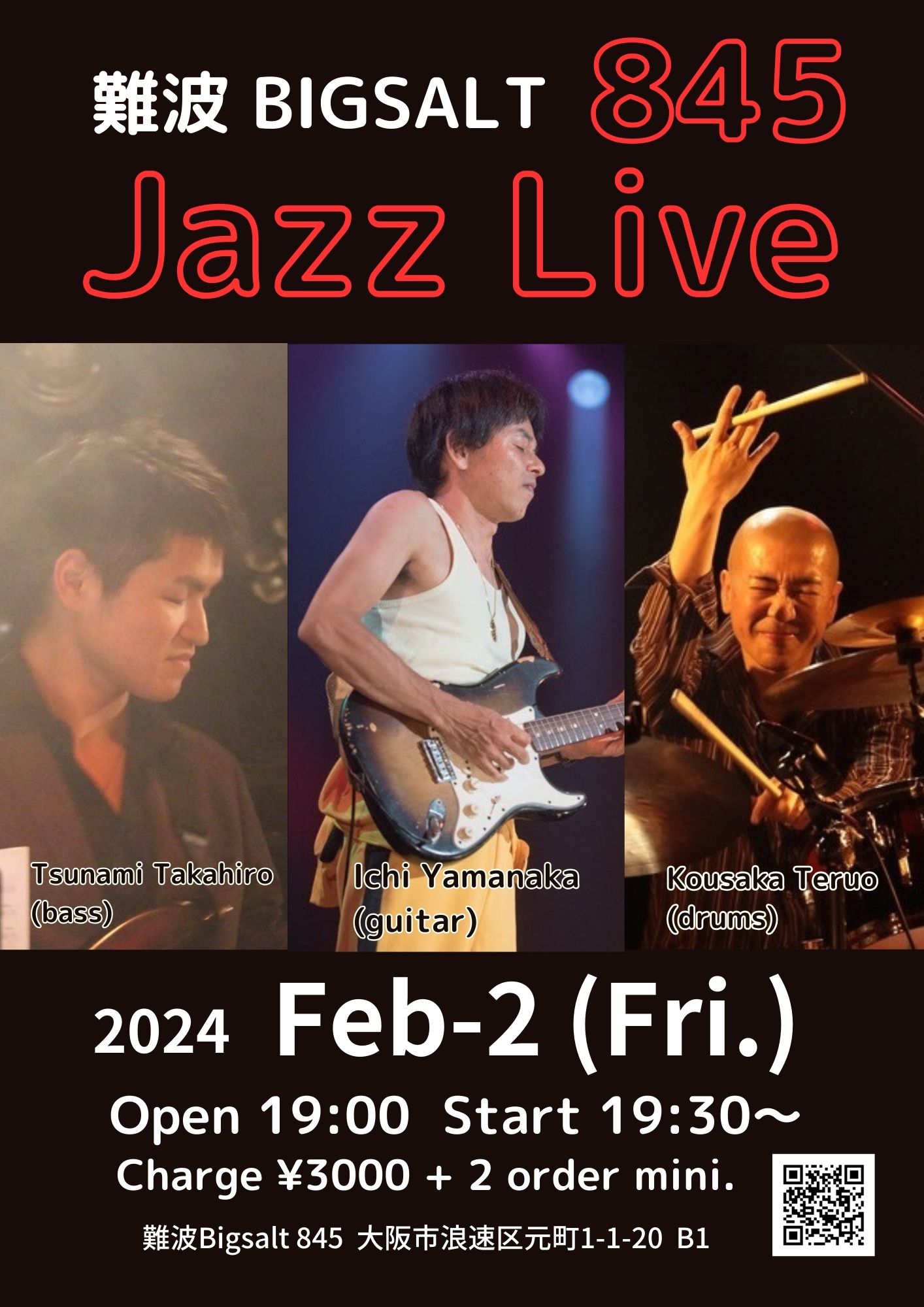 Jazz Live 2月 2 Fri 2024 難波 / Bigsalt845 メンバー イチ山中 (g) 津波貴寛 (b) コウサカテルオ(ds) チャージ¥3000+2オーダー別途要 前のスケジュール 次のスケジュール