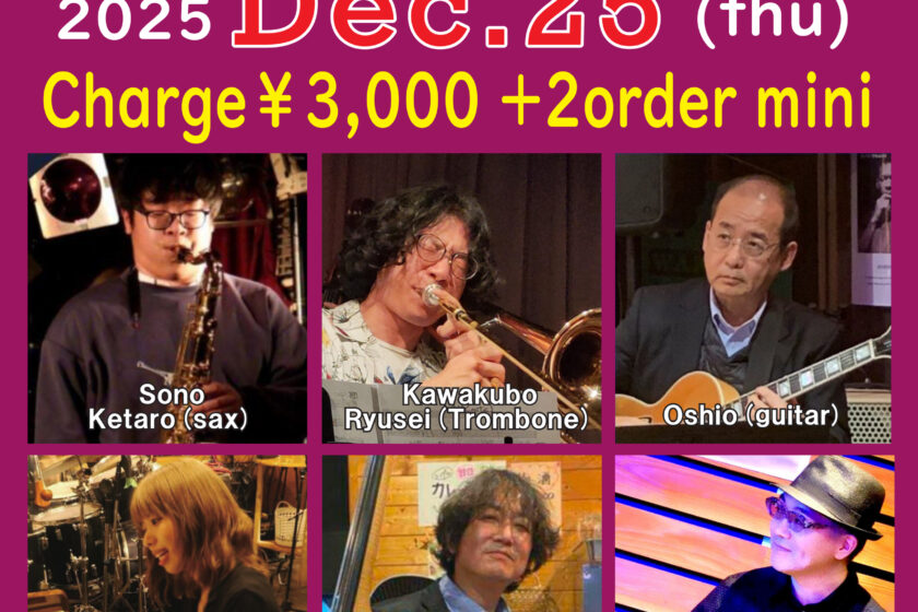 Jazz Live 12月 25 Thu 2025 難波 / Bigsalt845 メンバー 園恵太郎(sax)、川久保琉聖(tb)、松岡佐也可(p) Oshio(g)、張木浩司(b)、木村優一郎(ds) チャージ¥3000+2オーダー別途要 前のスケジュール 次のスケジュール