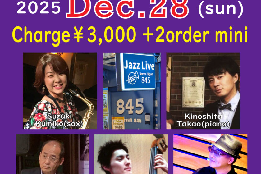 Jazz Live 12月 28 Sun 2025 難波 / Bigsalt845 メンバー 鈴木久美子(sax)、木下孝朗(p)、Oshio(g)、泉正浩(b)、木村優一郎(ds) チャージ¥3000+2オーダー別途要 前のスケジュール 次のスケジュール