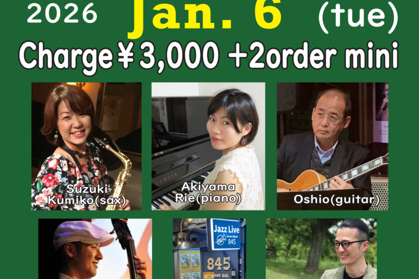 Jazz Live 1月 6 Tue 2026 難波 / Bigsalt845 メンバー 鈴木久美子(sax)、秋山莉恵(p)、Oshio(g) 真木 毅(b)、櫻井ティモ(ds) チャージ¥3000 + 2オーダー別途要 前のスケジュール 次のスケジュール