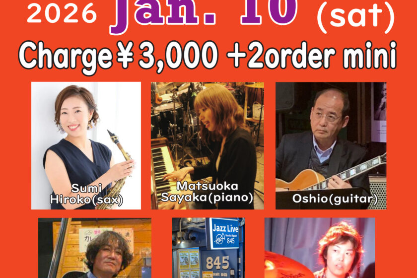 Jazz Live 1月 10 Sat 2026 難波 / Bigsalt845 メンバー 角裕子(sax)、松岡佐也可(p)、Oshio(g) 張木浩司(b)、小林真琴(ds) チャージ¥3000 + 2オーダー別途要 前のスケジュール 次のスケジュール