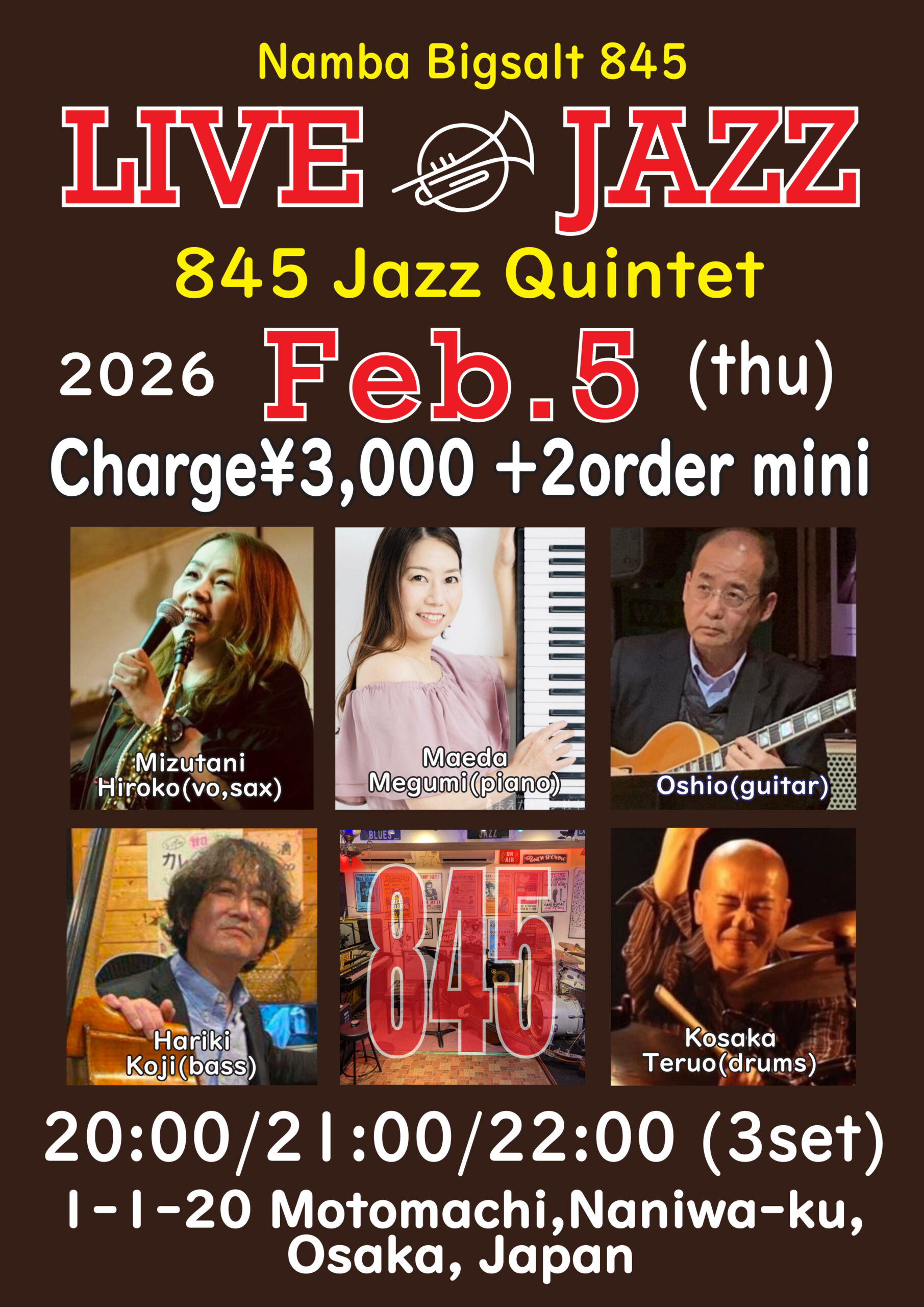 Jazz Live 2月 5 Thu 2026 難波 / Bigsalt845 メンバー 水谷浩子(sax&vo)、前田めぐみ(p)、Oshio(g) 張木浩司(b)、コウサカテルオ(ds) チャージ¥3000+2オーダー別途要 前のスケジュール 次のスケジュール