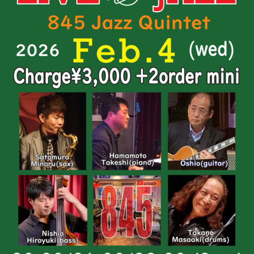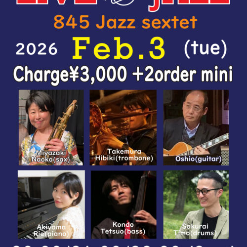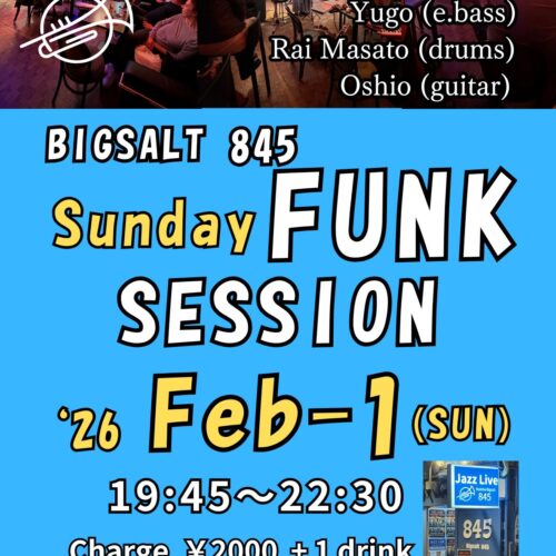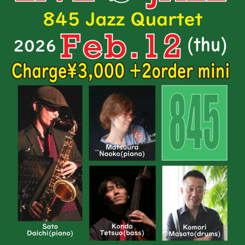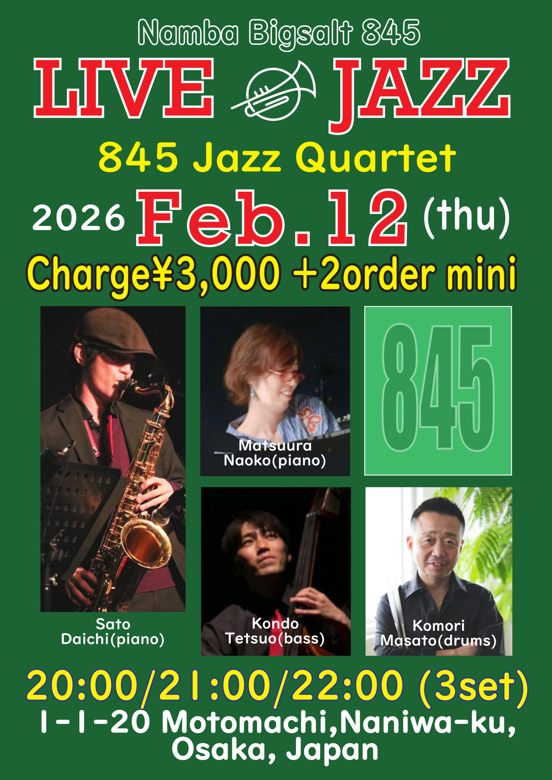 Jazz Live 2月 12 Thu 2026 難波 / Bigsalt845 メンバー 佐藤大地(sax)、松浦尚子(p)、近藤哲生(b)、小森まさと(ds) チャージ¥3000+2オーダー別途要 前のスケジュール 次のスケジュール