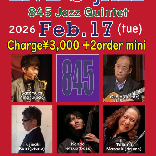Jazz Live 2月 17 Tue 2026 難波 / Bigsalt845 メンバー 里村稔(sax)、藤嵜佳里(p)、Oshio(g) 近藤哲生(b)、櫻井ティモ(ds) チャージ¥3000+2オーダー別途要 前のスケジュール 次のスケジュール