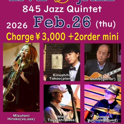 Jazz Live 2月 26 Thu 2026 難波 / Bigsalt845 メンバー 水谷浩子(sax&vo)、木下孝朗(p)、Oshio(g) 真木毅(b)、木村優一郎(ds) チャージ¥3000+2オーダー別途要 前のスケジュール 次のスケジュール