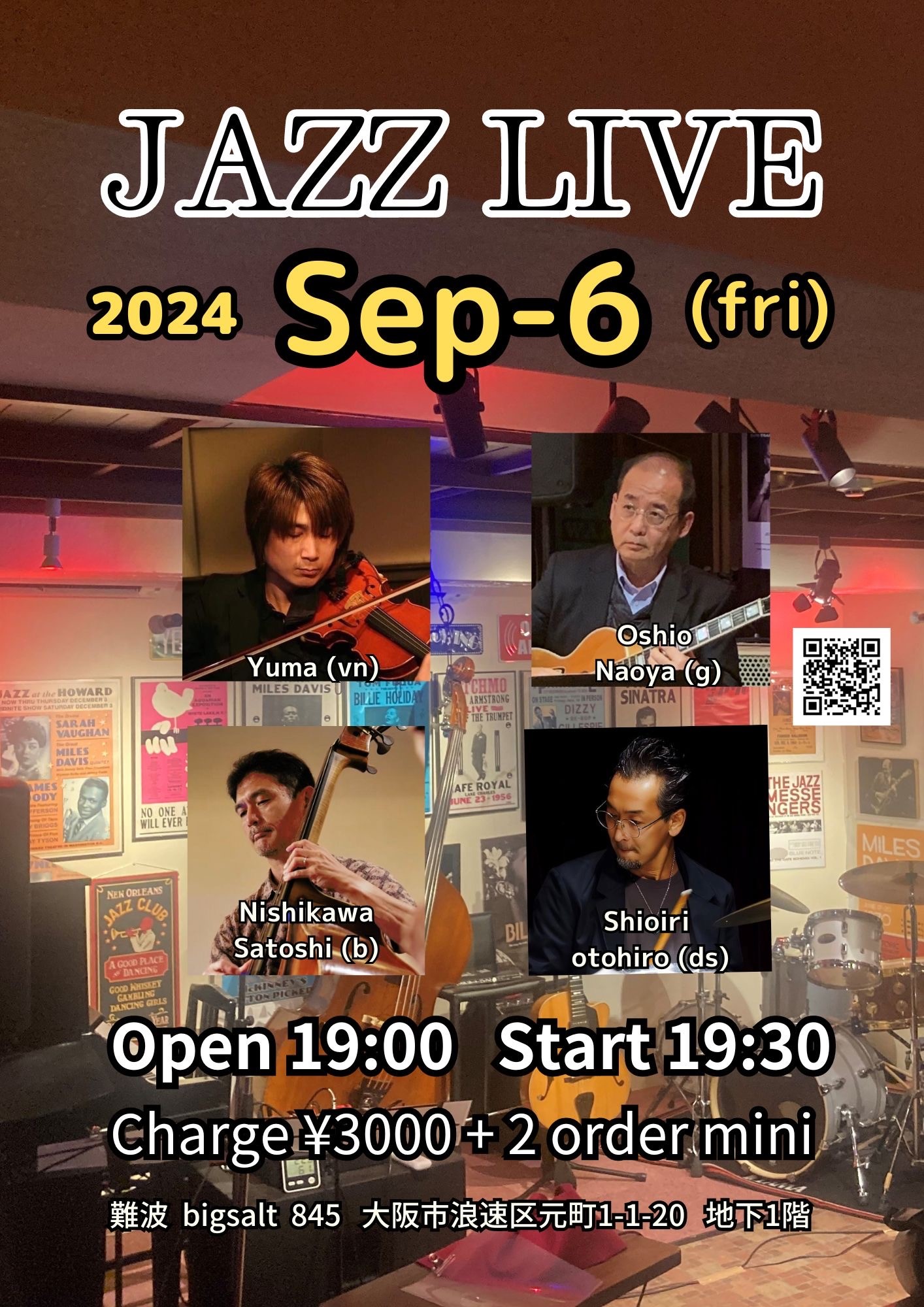 Jazz Live 9月 6 Fri 2024 難波 / Bigsalt845 メンバー ユーマ (vn) 大塩直哉(g) 未定(p) 西川サトシ(b) 塩入基弘(ds) チャージ¥3000+2オーダー別途要 前のスケジュール 次のスケジュール
