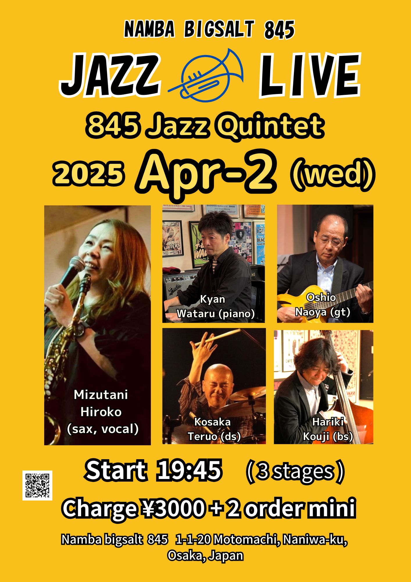Jazz Live 4月 2 Wed 2025 難波 / Bigsalt845 メンバー 水谷浩子(sax, vo), 喜屋武弥(p), 大塩直哉(g) 張木浩司(b), コウサカテルオ(ds) チャージ¥3000+2オーダー別途要 前のスケジュール 次のスケジュール