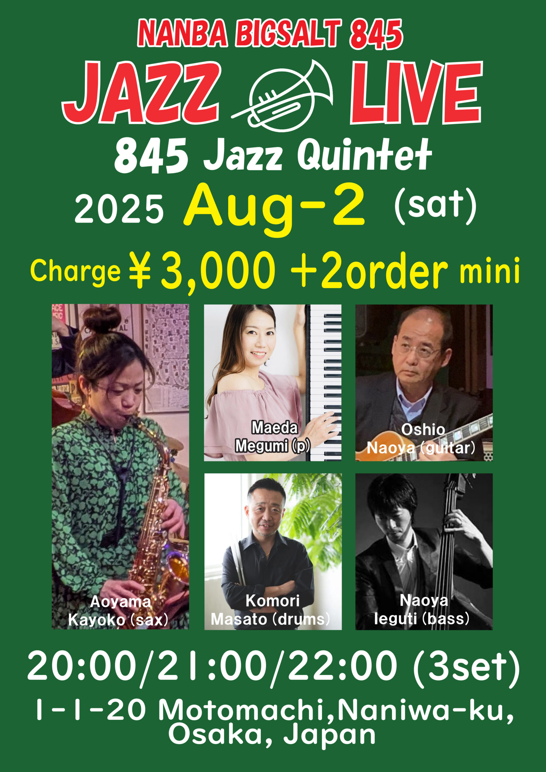 Jazz Live 8月 2 Sat 2025 難波 / Bigsalt845 メンバー 青山加世子(sax)、Oshio(g)、前田めぐみ(p) 家口直哉(b)、小森まさと(ds) チャージ¥3000+2オーダー別途要 前のスケジュール 次のスケジュール