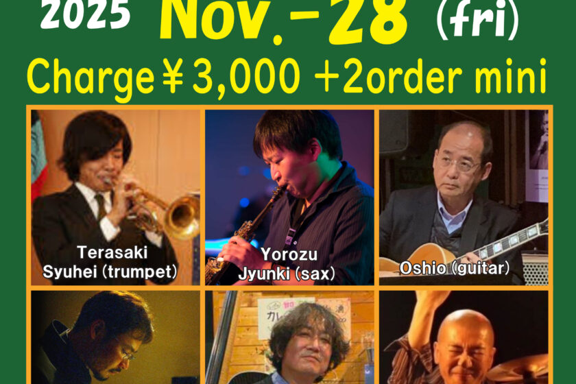 Jazz Live 845 The Sextet (毎月出演) 11月 28 Fri 2025 難波 / Bigsalt845 メンバー 寺崎周平(tp)、萬淳樹(sax)、Oshio(g) コウサカテルオ(ds)、藤井信之(p)、張木浩司(b) チャージ¥3000 + 2オーダー別途要 前のスケジュール 次のスケジュール