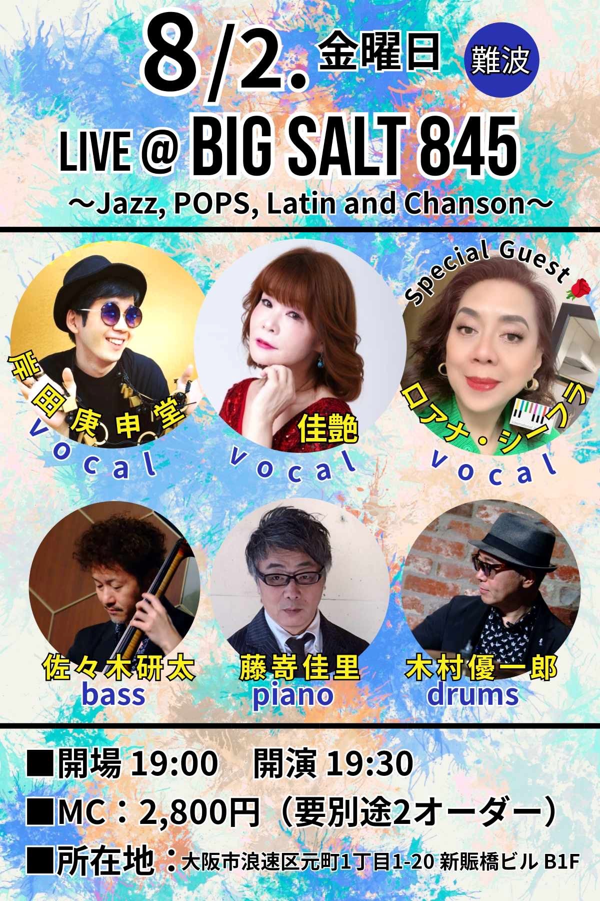 Jazz & Pops Live 8月 2 Fri 2024 難波 / Bigsalt845 メンバー 岸田庚申堂 (vo)、佳艶(vo)、ロアナ シーフラ(vo) 藤嵜佳理(p)、佐々木研太(b) 木村優一郎(ds) チャージ¥2800+2オーダー別途要 前のスケジュール 次のスケジュール