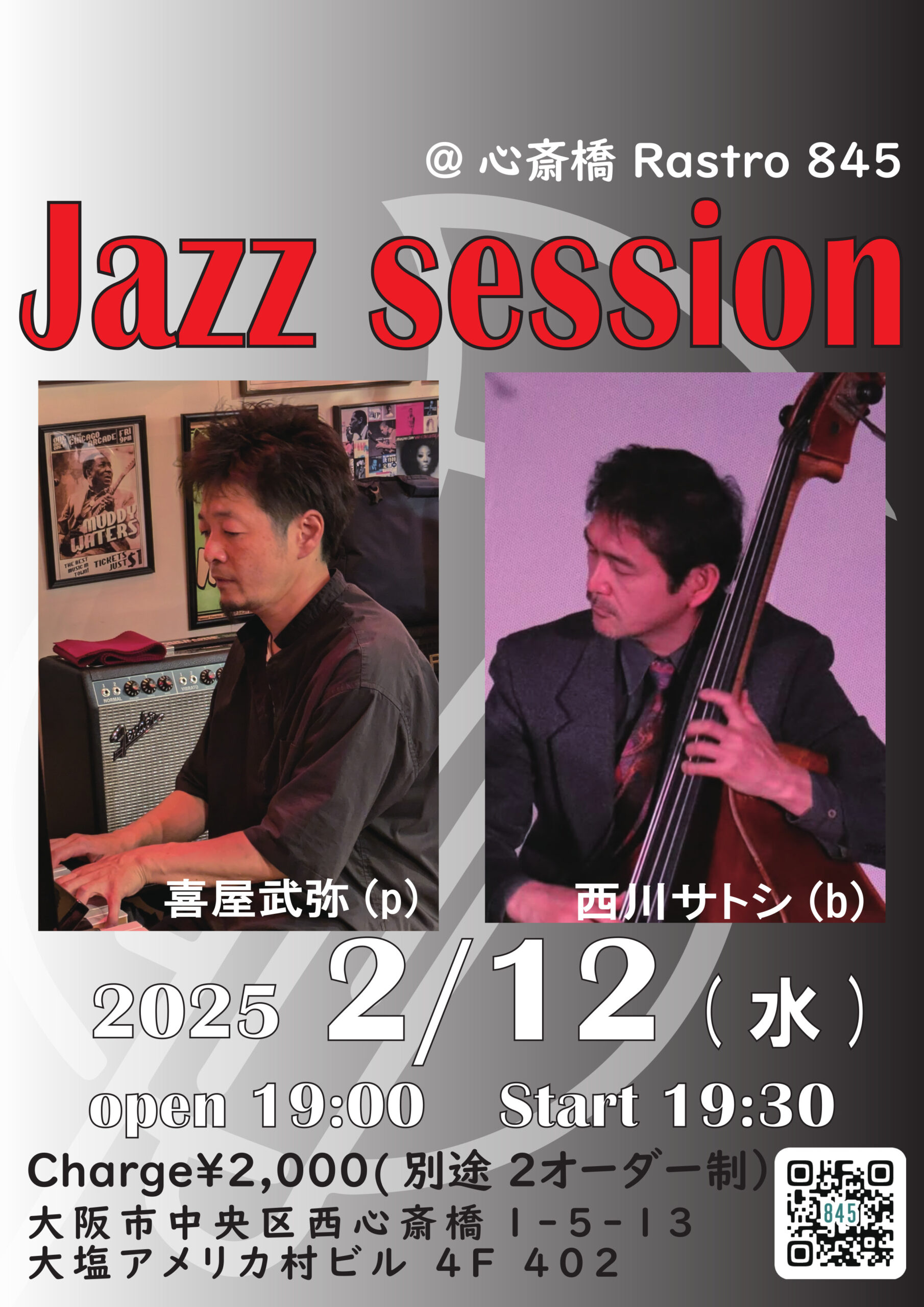 Jazz Session 2月 12 Wed 2025 心斎橋 / Rastro845 メンバー 西川サトシ(b) 喜屋武弥(p) チャージ¥2500+2オーダー別途要 前のスケジュール 次のスケジュール