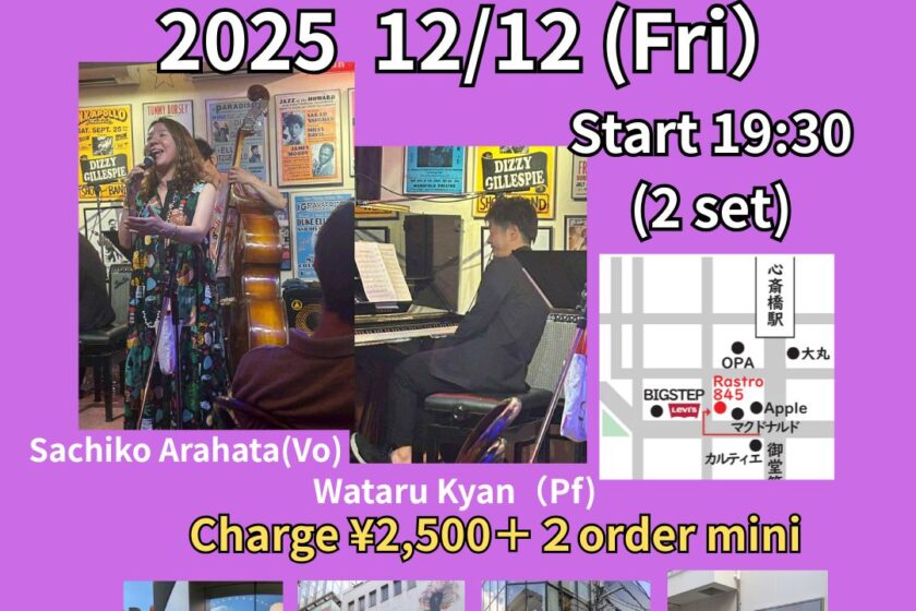 Jazz Live 12月 12 Fri 2025 心斎橋 / Rastro845 メンバー 荒畑佐千子(vo)、喜屋武弥(p) チャージ¥2500 + 2オーダー別途要 前のスケジュール 次のスケジュール