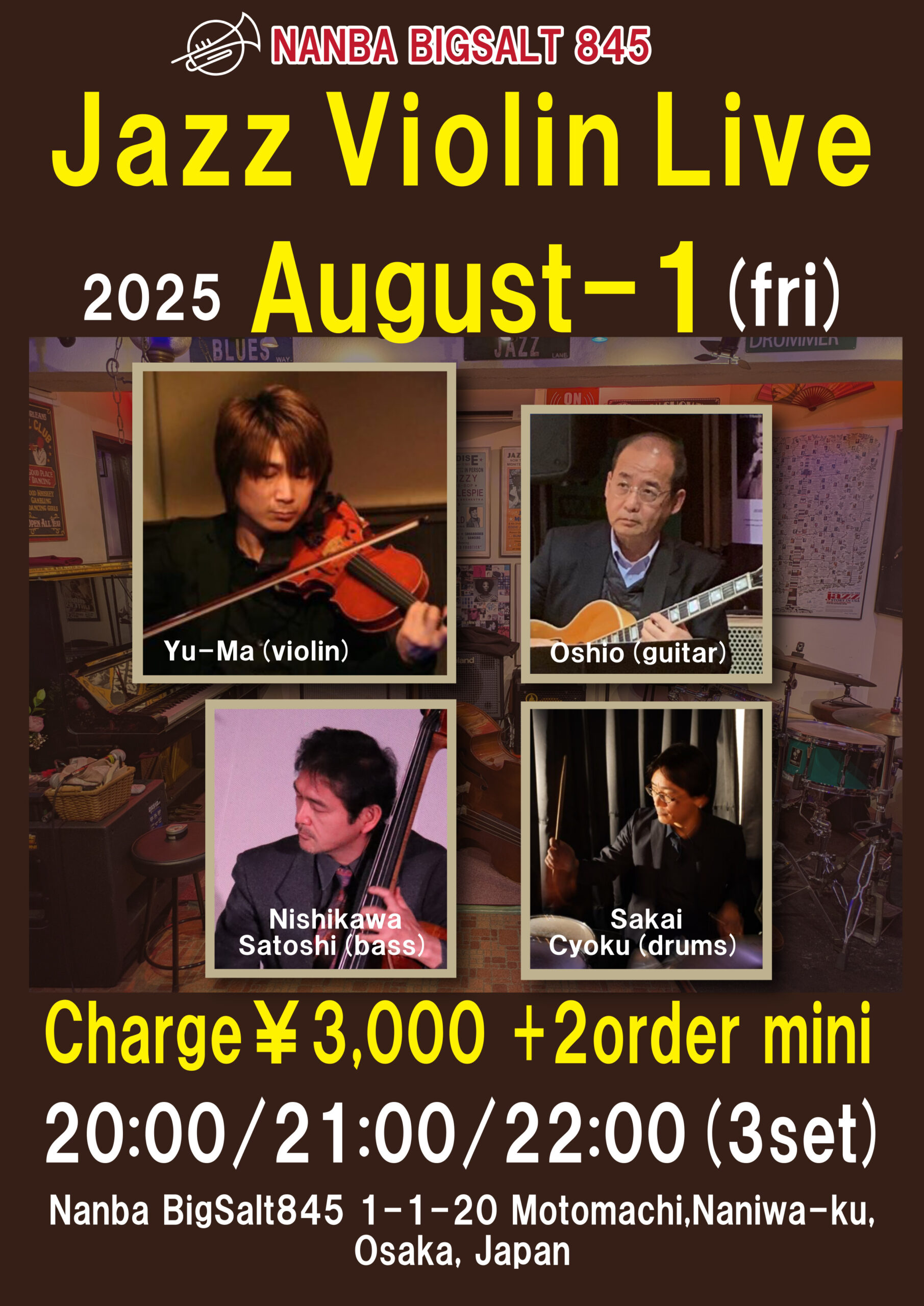 Jazz Violin Live (毎第1金曜) 8月 1 Fri 2025 難波 / Bigsalt845 メンバー Yuma(vn)、Oshio(g)、西川サトシ(b)、阪井ちょく(ds) チャージ¥3000+2オーダー別途要 前のスケジュール 次のスケジュール