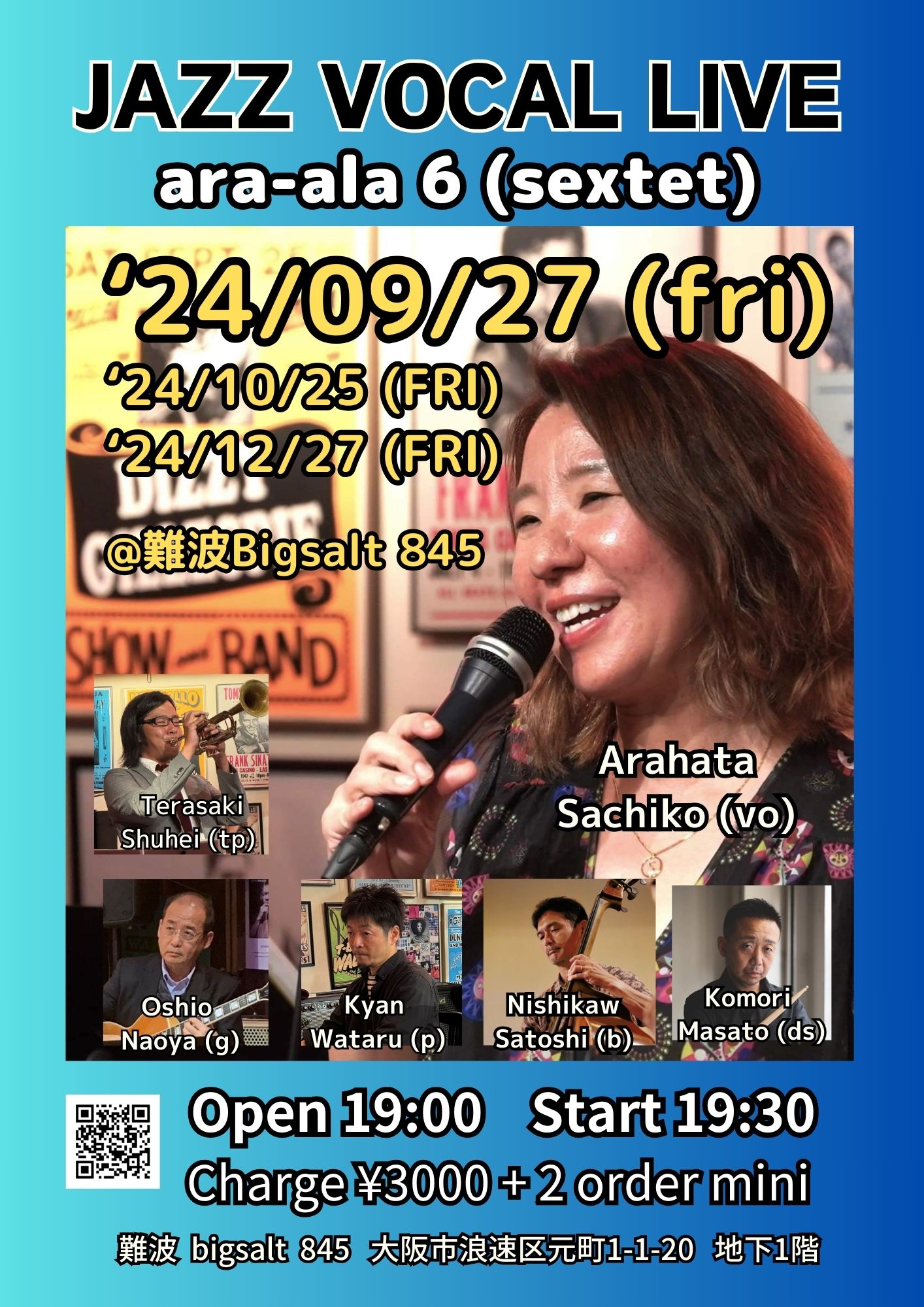 Jazz Vocal Live・ara-ala 6 (sextet) 9月 27 Fri 2024 難波 / Bigsalt845 メンバー 荒畑佐千子 (vo)、寺崎周平 (tp) 大塩直哉(g)、喜屋武弥(b) 西川サトシ(b)、小森まさと (ds) チャージ¥3000+2オーダー別途要 前のスケジュール 次のスケジュール