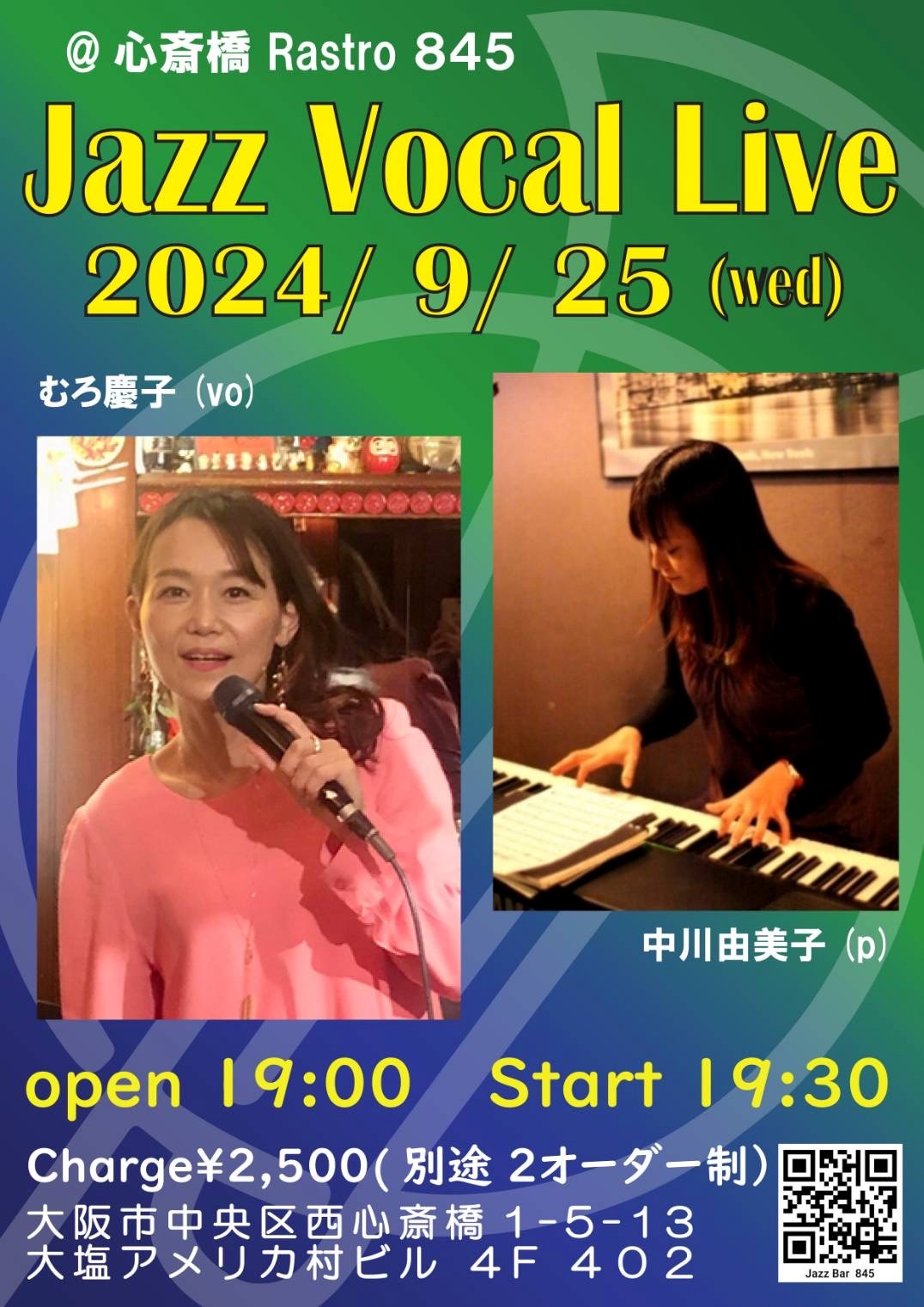 Jazz Vocal Live 9月 25 Wed 2024 心斎橋 / Rastro845 メンバー 中川由美子 (p) むろ慶子 (vo) チャージ¥2500+2オーダー別途要 前のスケジュール 次のスケジュール