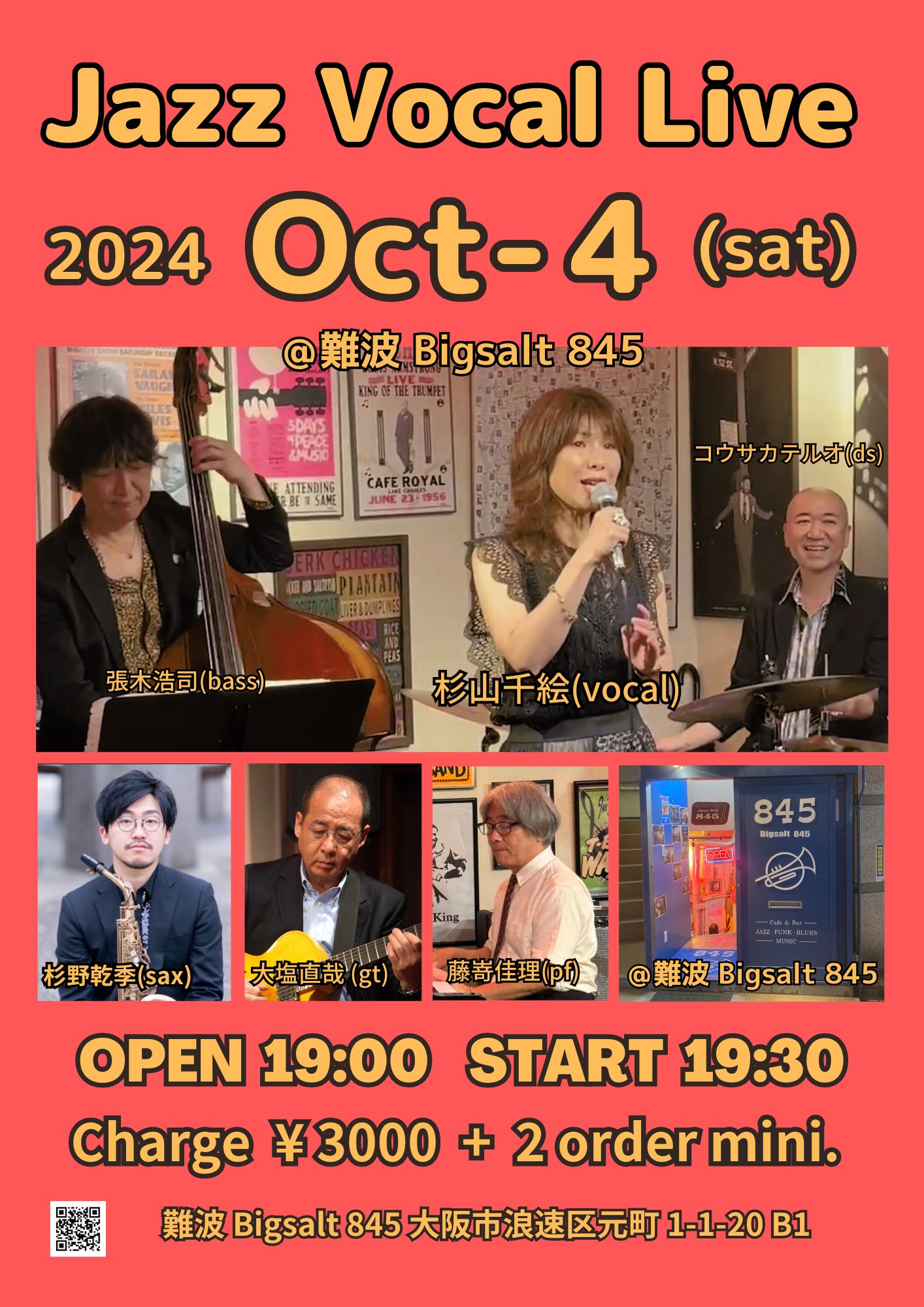 Jazz Vocal Live 10月 4 Fri 2024 難波 / Bigsalt845 メンバー 杉山千絵 (vo) 杉野乾季(sax), 大塩直哉(g) 藤嵜佳里(p), 張木浩司(b) コウサカテルオ(ds) チャージ¥3000+2オーダー別途要 前のスケジュール 次のスケジュール