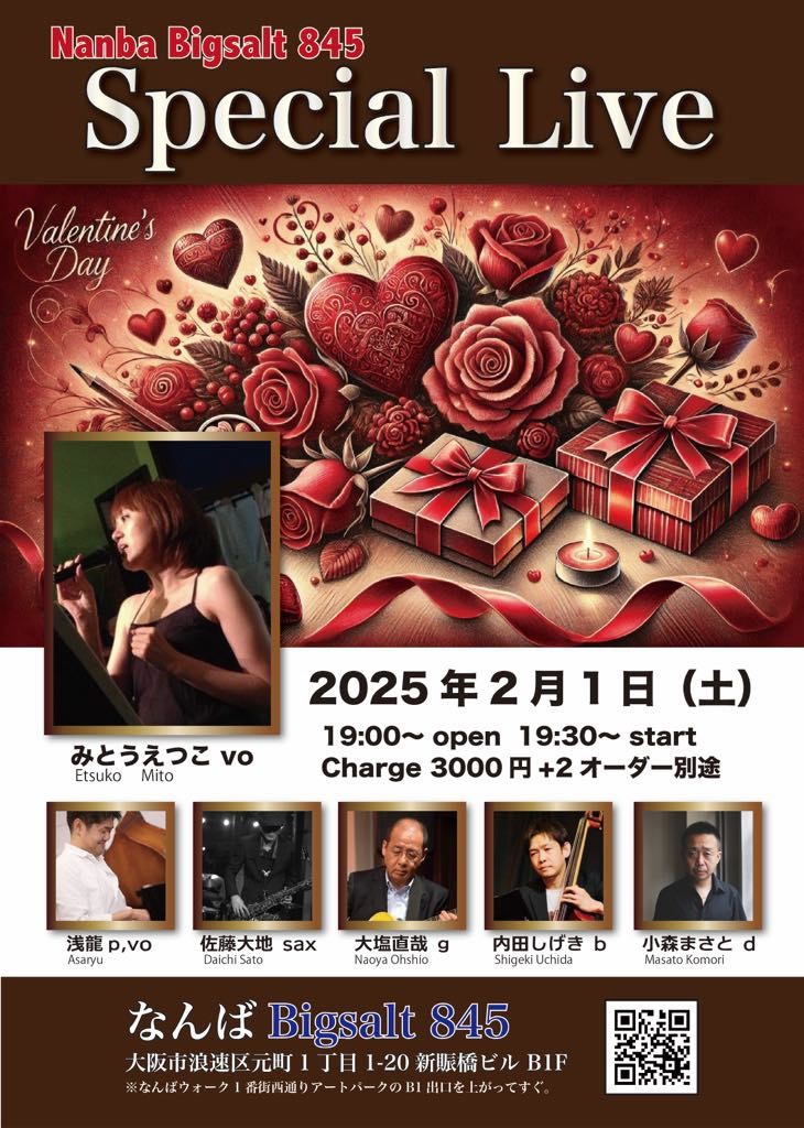 Jazz Vocal Live 2月 1 Sat 2025 難波 / Bigsalt845 メンバー みとうえつこ (vo), 浅龍(p, vo) 佐藤大地(sax), 大塩直哉(g) 内田しげき (b), 小森まさと (ds) チャージ¥3000+2オーダー別途要 前のスケジュール 次のスケジュール