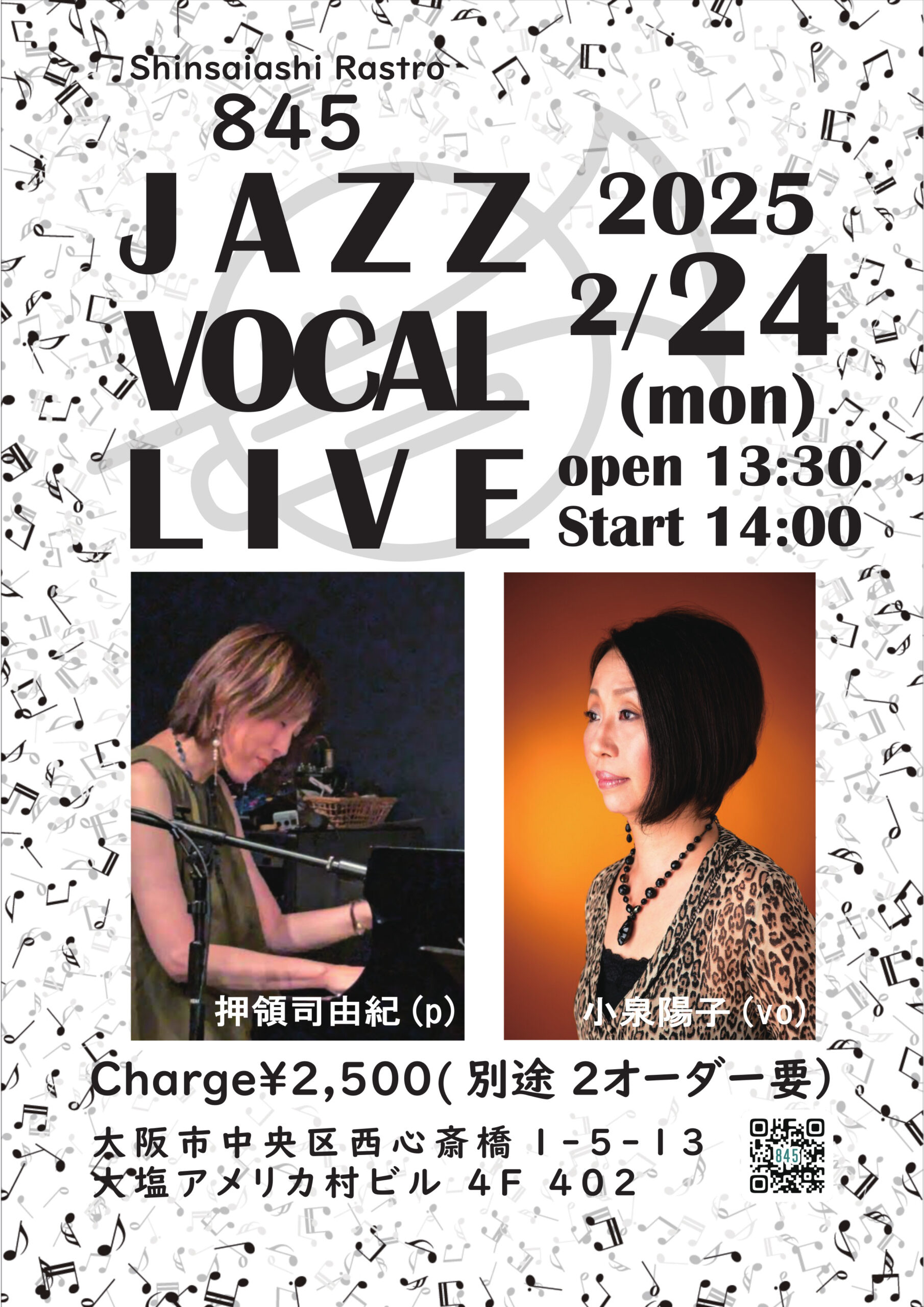 Jazz Vocal Live 2月 24 Mon 2025 心斎橋 / Rastro845 メンバー 押領司由紀(p) 小泉陽子(vo) チャージ¥2500+2オーダー別途要 前のスケジュール 次のスケジュール