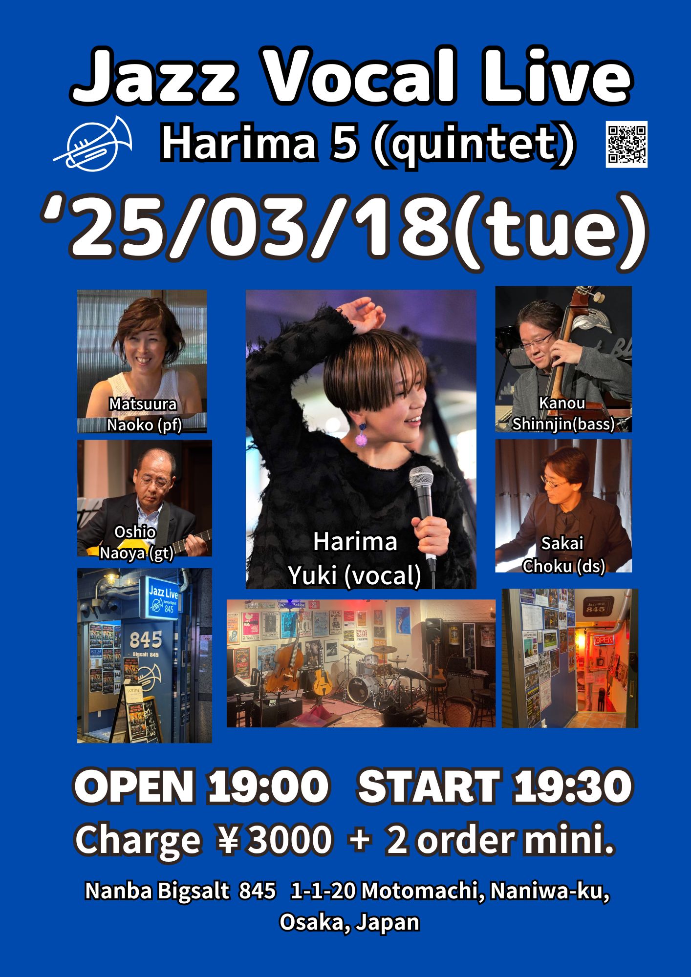 Jazz Vocal Live 3月 18 Tue 2025 難波 / Bigsalt845 メンバー 播摩有紀(vo), 松浦尚子(p), 大塩直哉(g), 加納真治(b), 阪井ちょく(ds) チャージ¥3000+2オーダー別途要 前のスケジュール 次のスケジュール