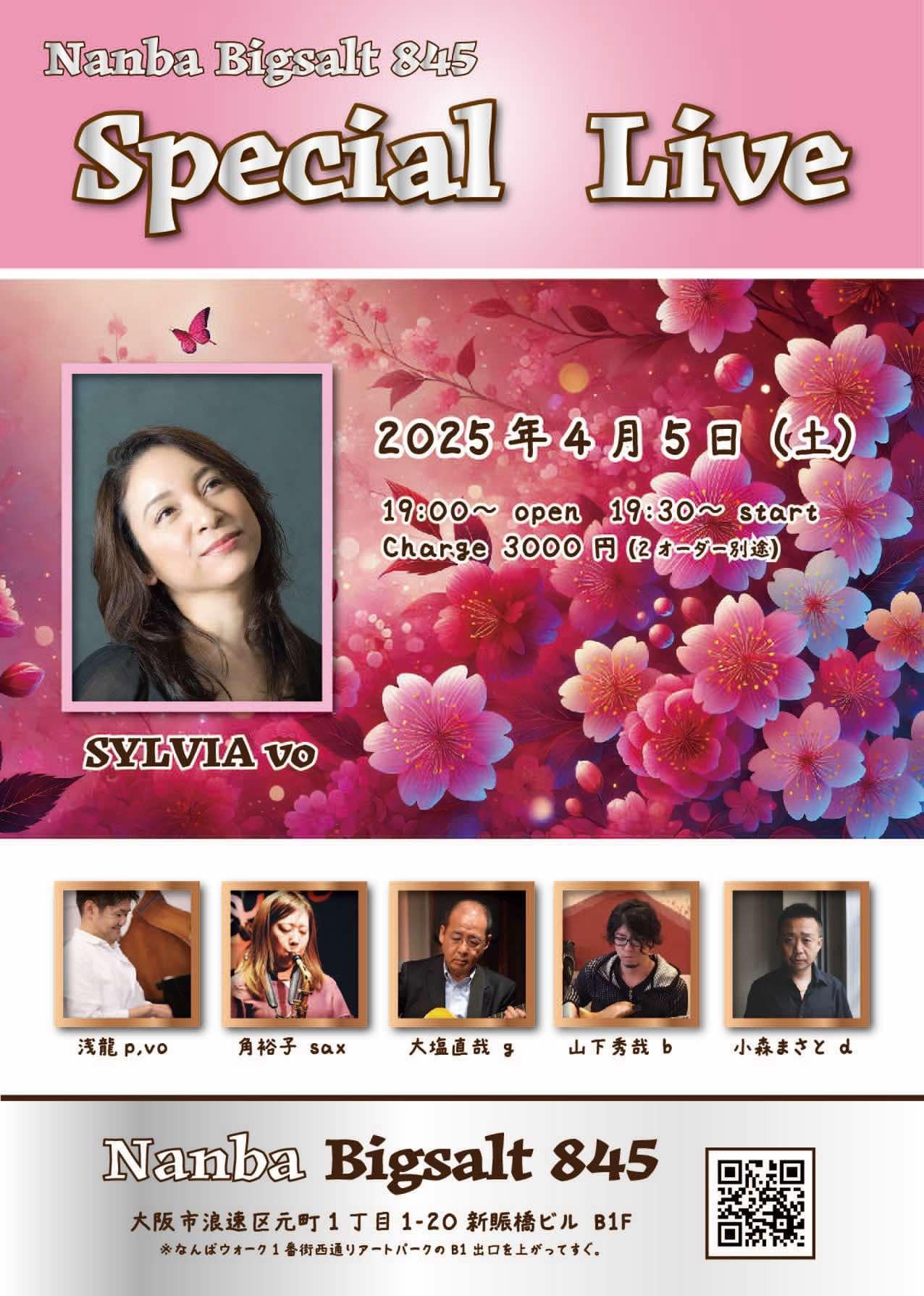 Jazz Vocal Live 4月 5 Sat 2025 難波 / Bigsalt845 メンバー Silvia(vo) 浅龍(vo.p) 角裕子(sax) 大塩直哉(g) 山下秀哉(b) チャージ¥3000 + 2オーダー別途要 前のスケジュール 次のスケジュール