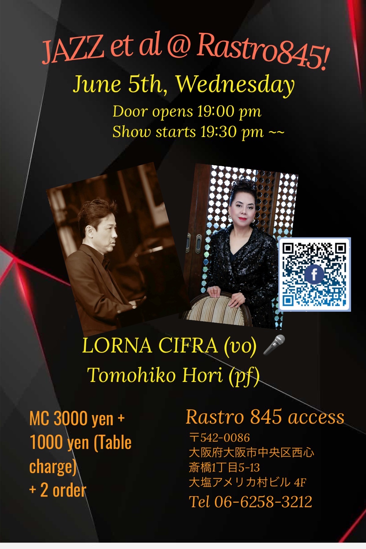 Jazz Vocal Live 6月 5 Wed 2024 心斎橋 / Rastro845 メンバー Lorna Cifra (vo) Hori Tomohiko (p) チャージ¥4000+2オーダー別途要 前のスケジュール 次のスケジュール