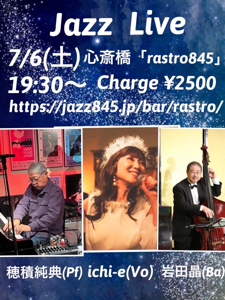 Jazz Vocal Live 7月 6 Sat 2024 心斎橋 / Rastro845 メンバー ichie (vo) 穂積純典(p) 岩田 晶 (b) チャージ¥2500+2オーダー別途要 前のスケジュール 次のスケジュール