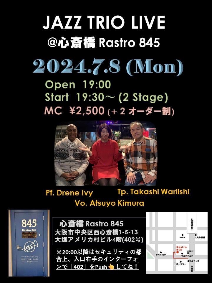 Jazz Vocal Live 7月 8 Mon 2024 心斎橋 / Rastro845 メンバー 木村篤世 (vo) Drene Ivy (p) 割石孝 (tp) チャージ¥2500+2オーダー別途要 前のスケジュール 次のスケジュール