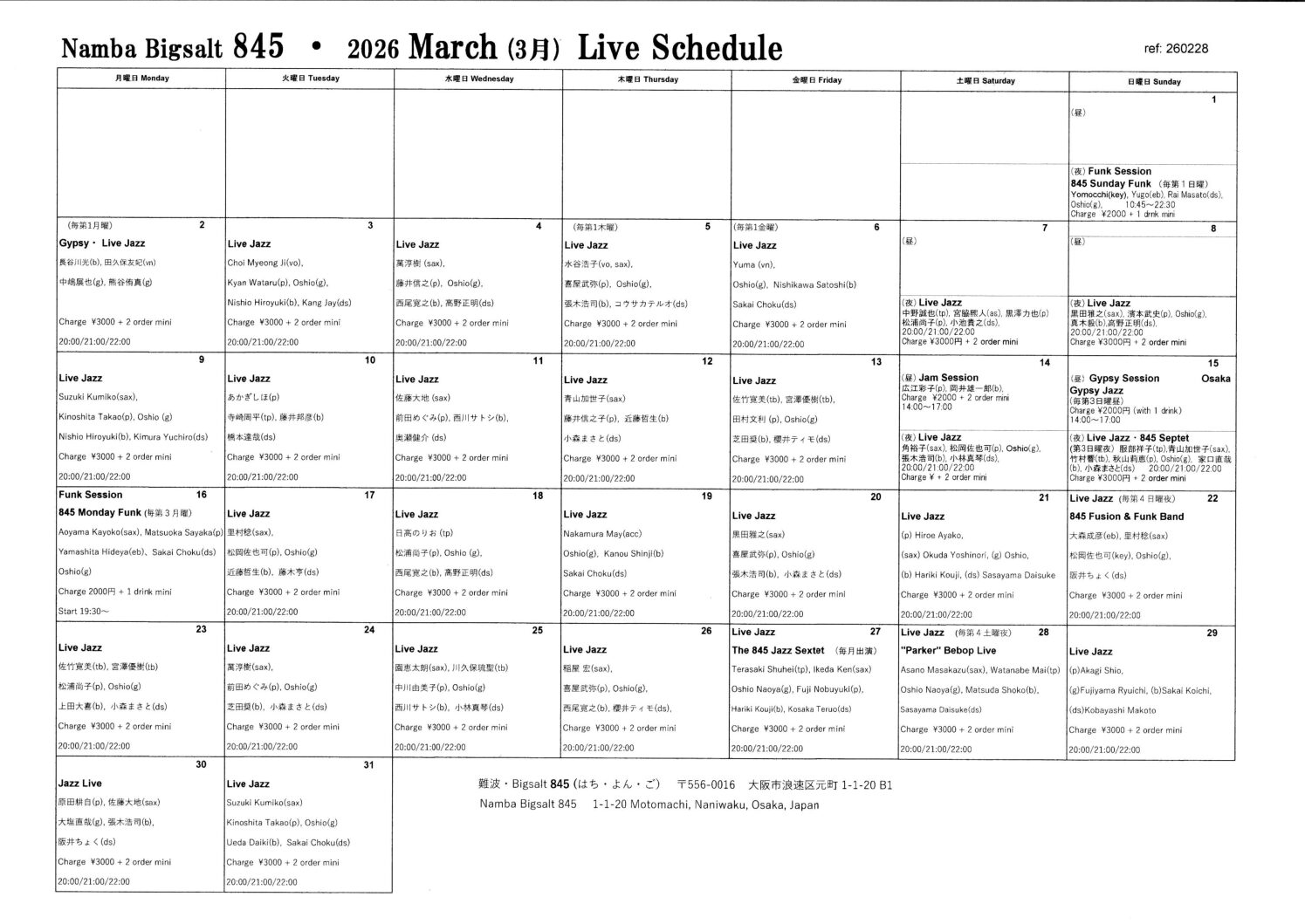 Live Jazz (每第1金曜) 3月 6 Fri 2026 難波 / Bigsalt845 メンバー Yuma (vn),Oshio(g), Nishikawa Satoshi(b),Sakai Choku(ds) 前のスケジュール 次のスケジュール