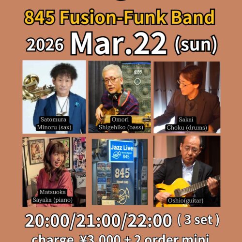 Live Jazz (毎第4日曜夜) 845 Fusion & Funk Band 3月 22 Sun 2026 難波 / Bigsalt845 メンバー 大森成彦(eb),里村稔(sax),松岡佐也可(key), Oshio(g),阪井ちょく(ds) 前のスケジュール 次のスケジュール