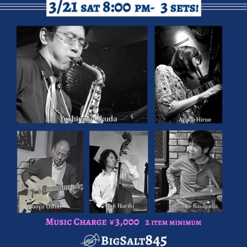 Live Jazz 3月 21 Sat 2026 難波 / Bigsalt845 メンバー (p) Hiroe Ayako,(sax) Okuda Yoshinori, (g) Oshio, (b) Hariki Kouji, (ds) Sasayama Daisuke 前のスケジュール 次のスケジュール