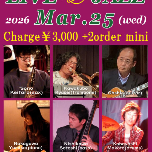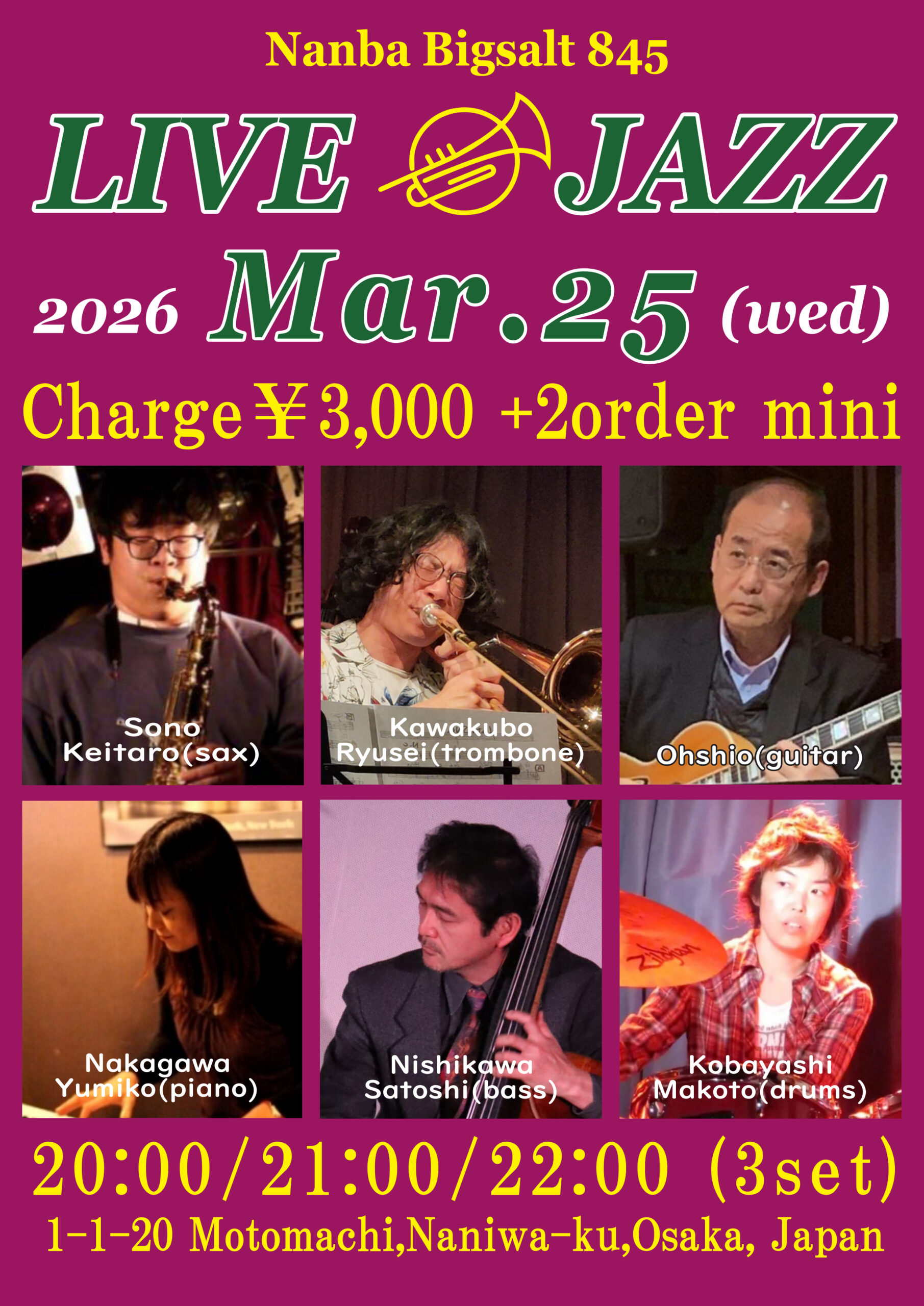 Live Jazz 3月 25 Wed 2026 難波 / Bigsalt845 メンバー 園恵太郎(sax)、川久保琉聖(tb)、中川由美子(p) Oshio(g)、西川サトシ(b)、小林真琴(ds) 前のスケジュール 次のスケジュール