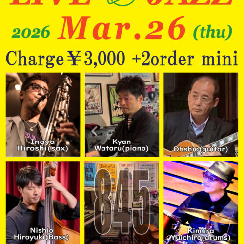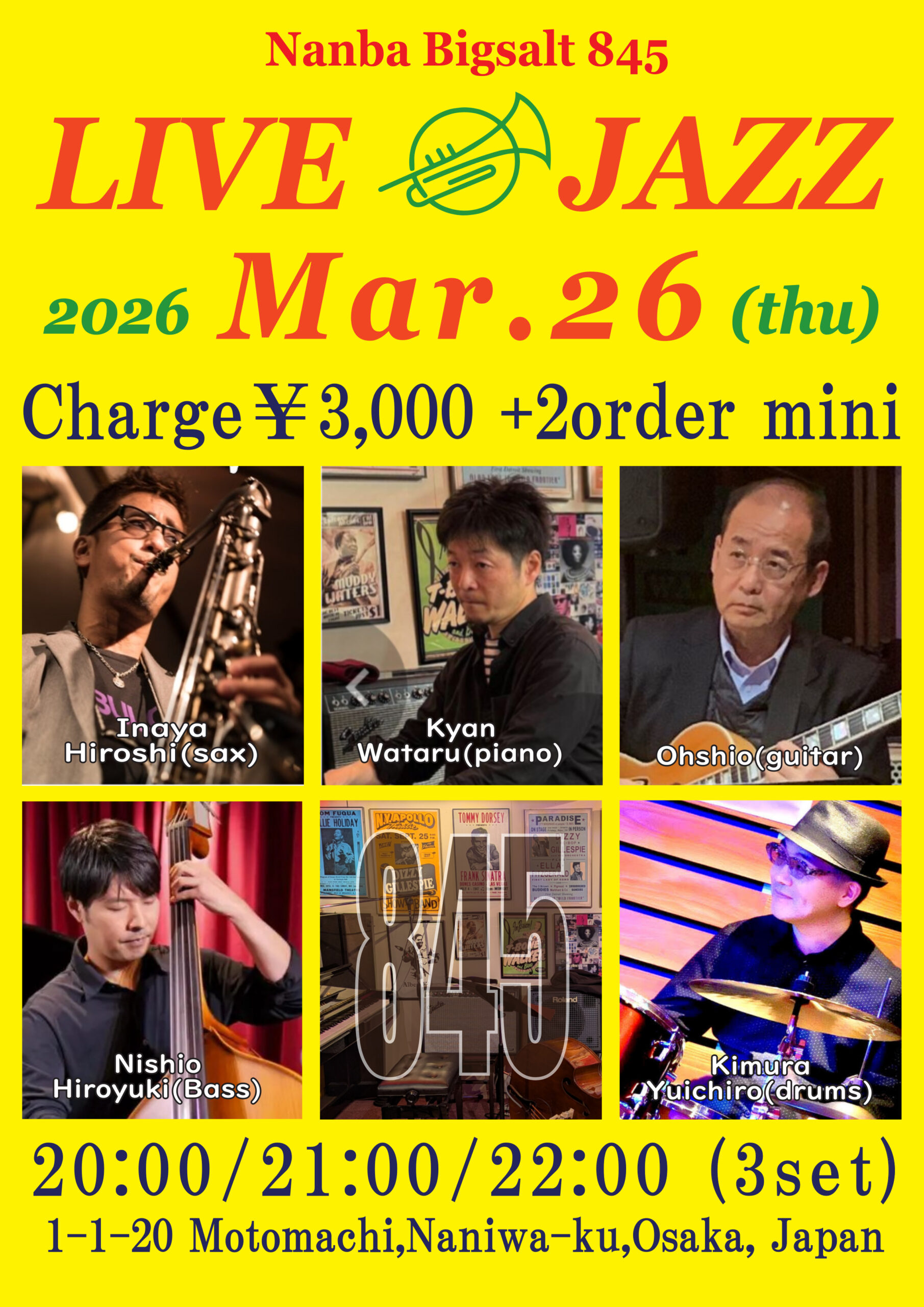 Live Jazz 3月 26 Thu 2026 難波 / Bigsalt845 メンバー 稲尾 宏(sax),喜屋武弥(p),Oshio(g) 西尾寛之(b)、木村優一郎(ds) 前のスケジュール 次のスケジュール