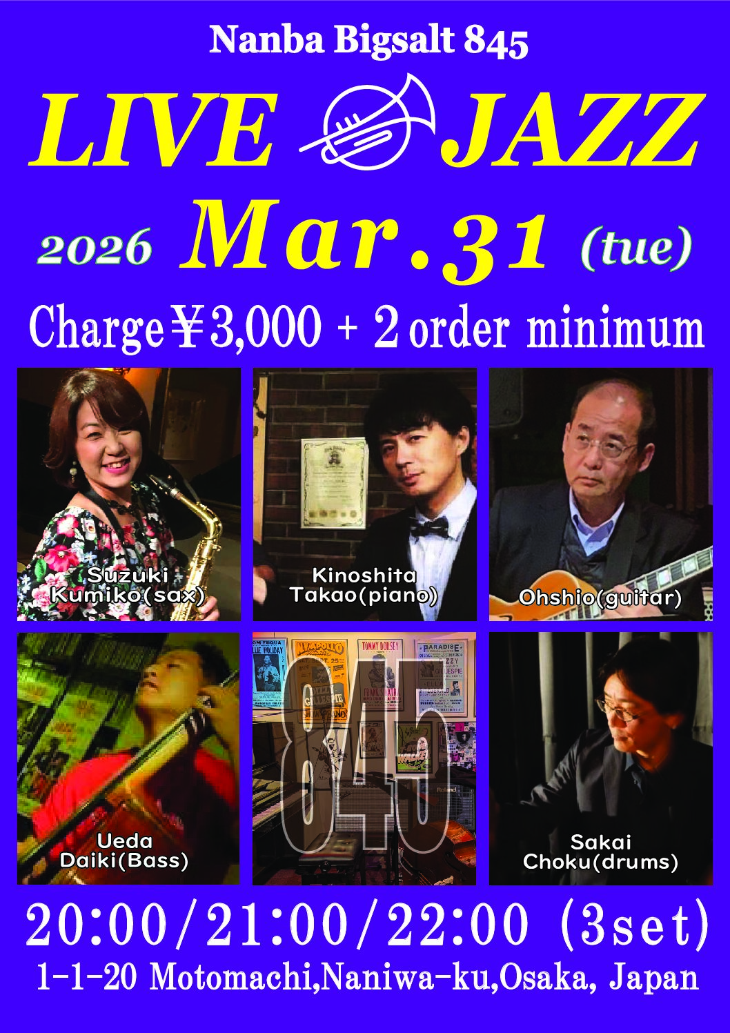 Live Jazz 3月 31 Tue 2026 難波 / Bigsalt845 メンバー Suzuki Kumiko (sax),Kinoshita Takao(p), Oshio(g) Ueda Daiki (b), Sakai Choku(ds) 前のスケジュール 次のスケジュール