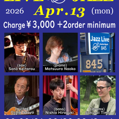 Live Jazz 4月 13 Mon 2026 難波 / Bigsalt845 メンバー (sax) Sono Keitarou, (p) Matsuura Naoko, (g) Oshio (b) Nishio Hiroyuki, (ds) Sakurai Timo チャージ¥3000+2オーダー別途要 前のスケジュール 次のスケジュール
