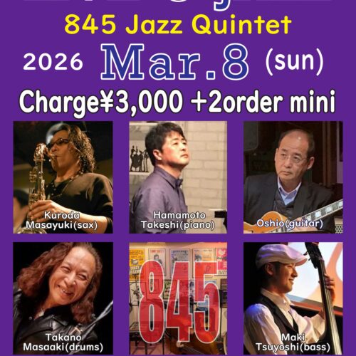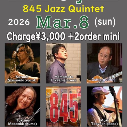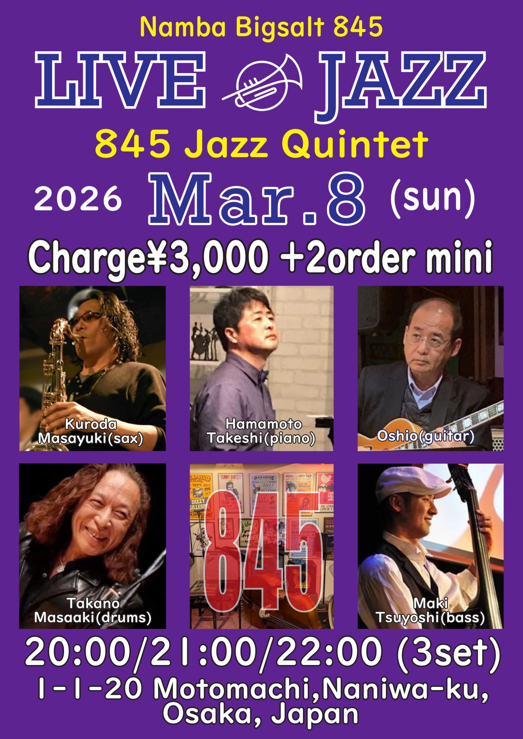 Live Jazz 3月 8 Sun 2026 難波 / Bigsalt845 メンバー 黑田雅之(sax),濱本武史 (p), Oshio(g),真木毅 (b),高野正明(ds) 前のスケジュール 次のスケジュール