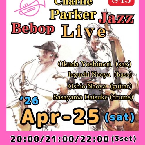 Live Jazz (the 4th Sat of every month) “Parker” Bebop Live 4月 25 Sat 2026 難波 / Bigsalt845 メンバー (sax) Okuda Yoshinori, (g) Oshio Naoya (b) leguchi Naoya, (ds) Sasayama Daisuke チャージ¥3000+2オーダー別途要 前のスケジュール 次のスケジュール