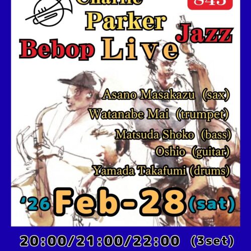 “Parker” Be-bop Jazz Live 2月 28 Sat 2026 難波 / Bigsalt845 メンバー 浅野まさかず(sax)、渡邉麻衣(tp)、Oshio(g)、 松田尚子(b), 山田隆史(ds) チャージ¥3000+2オーダー別途要 前のスケジュール 次のスケジュール