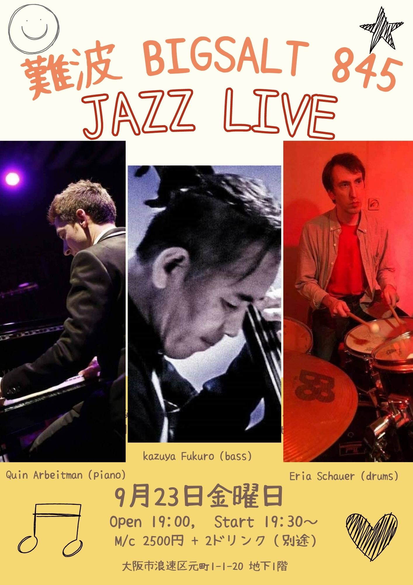 Nature Boys Quin Arbeitman(p) + Eric Schauer(ds) + 福呂和也(b) 9月 23 Fri 2022 難波 / Bigsalt845 メンバー Quin Arbeitman(p) Eric Schauer(ds) 福呂和也(b) チャージ¥2500+ドリンク別(2杯以上注文) 前のスケジュール 次のスケジュール