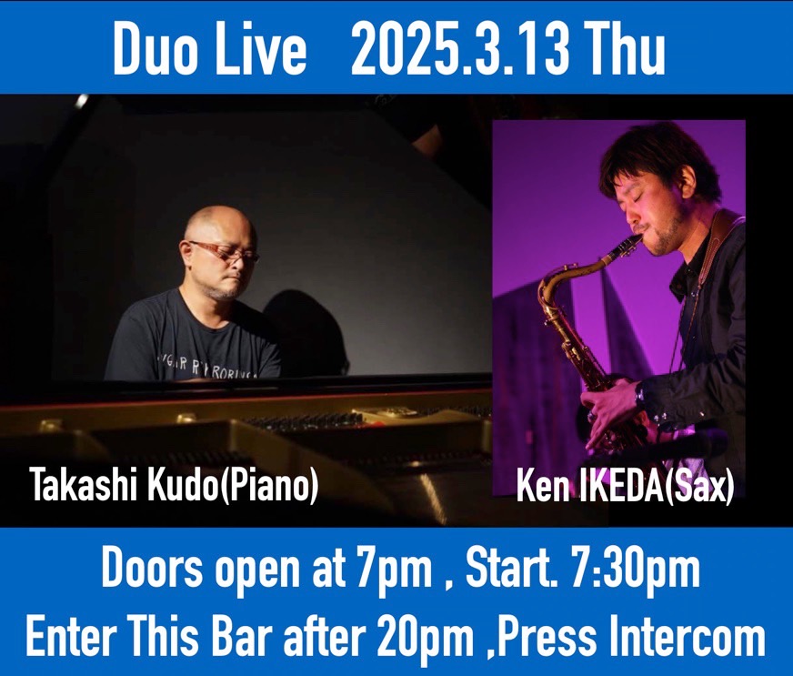 ”Sax & Piano” DUO LIVE 3月 13 Thu 2025 心斎橋 / Rastro845 メンバー 池田ケン(ts) 工藤隆(p) チャージ¥3000+2オーダー別途要 前のスケジュール 次のスケジュール